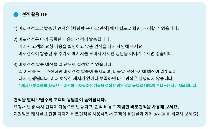 바로견적은 사전에 고수님이 견적 발송을 원하는 조건을 설정해두면, 조건에 맞는 요청서가 확인되는 즉시 견적을 발송하는 기능입니다. 각 서비스별로 1개씩 등록 가능하며, 요청서 조건, 지역, 하루 최대 예산, 견적 문구, 견적금액을 설정할 수 있습니다.