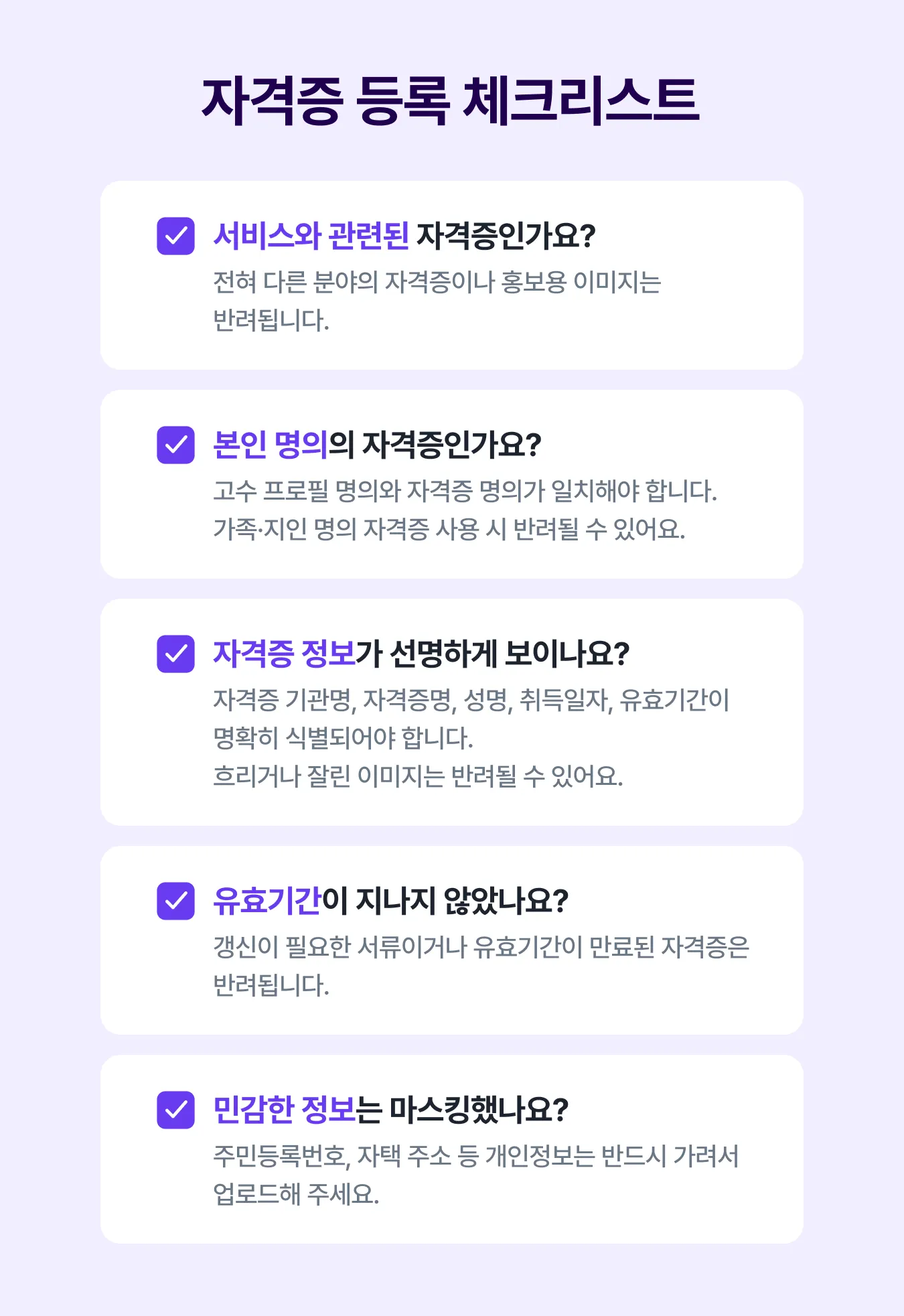 ※ 서비스와 무관하거나 허위∙변조된 자격증을 등록할 경우 고수 활동에 제약이 생길 수 있습니다.