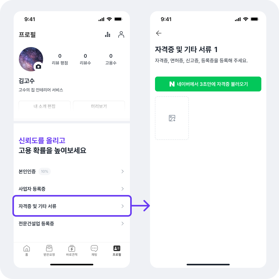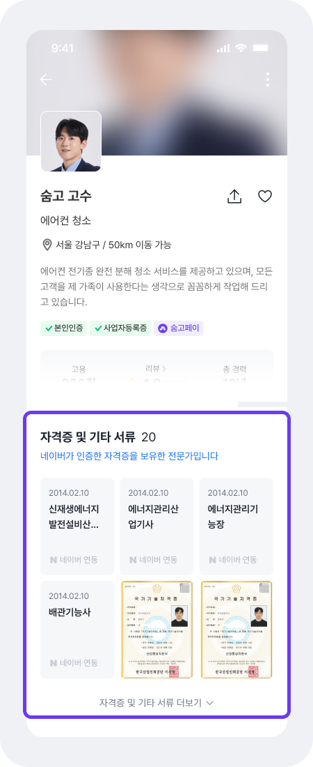 네이버 자격증 연동을 이용하면, 보다 간편하게 자격증을 등록할 수 있으며, 아래 이미지와 같이 네이버 자격 인증 문구가 자동으로 표시되어 고수님의 전문성을 증명할 수 있어요.