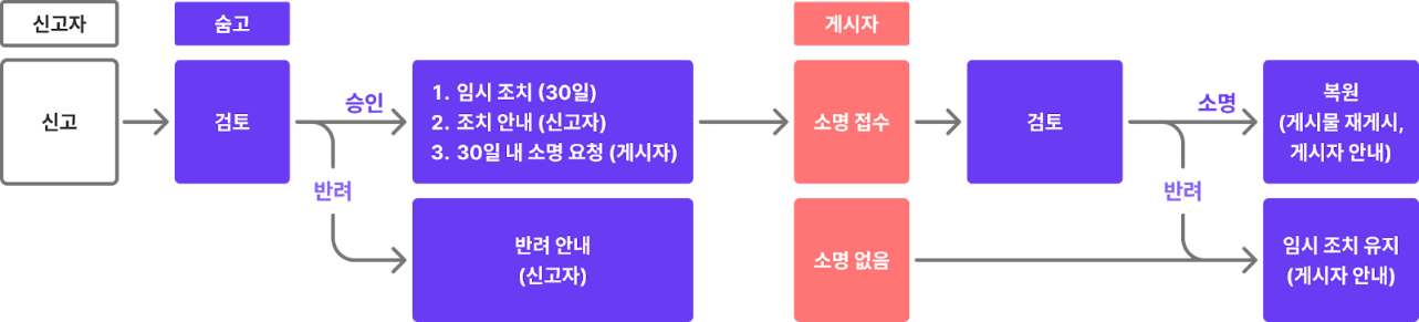 - 임시 조치 시, 게시자에게 임시 조치 요청 사유와 함께 신고자명(개인은 권리주장자, 단체는 단체명)과 증빙 자료가 전달될 수 있어요.