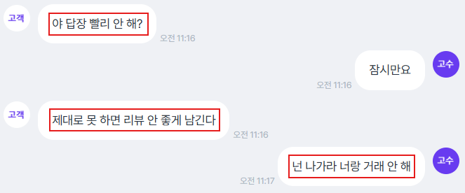 [채팅 예시] | 고객은 고수의 답변이 늦다는 이유로 반말과 고압적인 표현을 반복했고, 이에 고수도 함께 반말을 사용했어요. → 반말/고압적 어투는 상대방에게 불쾌감을 주는 약관 위반 행위예요. |