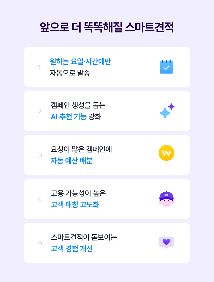 스마트견적은 더 편리하고 효과적으로 계속 발전될 예정입니다. 고수님의 운영 부담을 줄이고 성과를 높이기 위한 개선을 기대해 주세요.