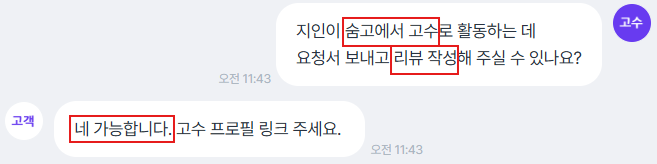 [채팅 예시] | 고객은 지인의 고수 계정에 → 요청한 고객과 이를 수락한 고수 모두 약관 위반에 해당해요. |