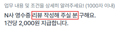 정상적인 서비스 이용 목적이 아닌 리뷰 조작/허위 홍보 목적의 활동으로 간주돼요. - 리뷰 아르바이트를 요청하거나 이에 응해 허위 리뷰를 작성하는 경우,